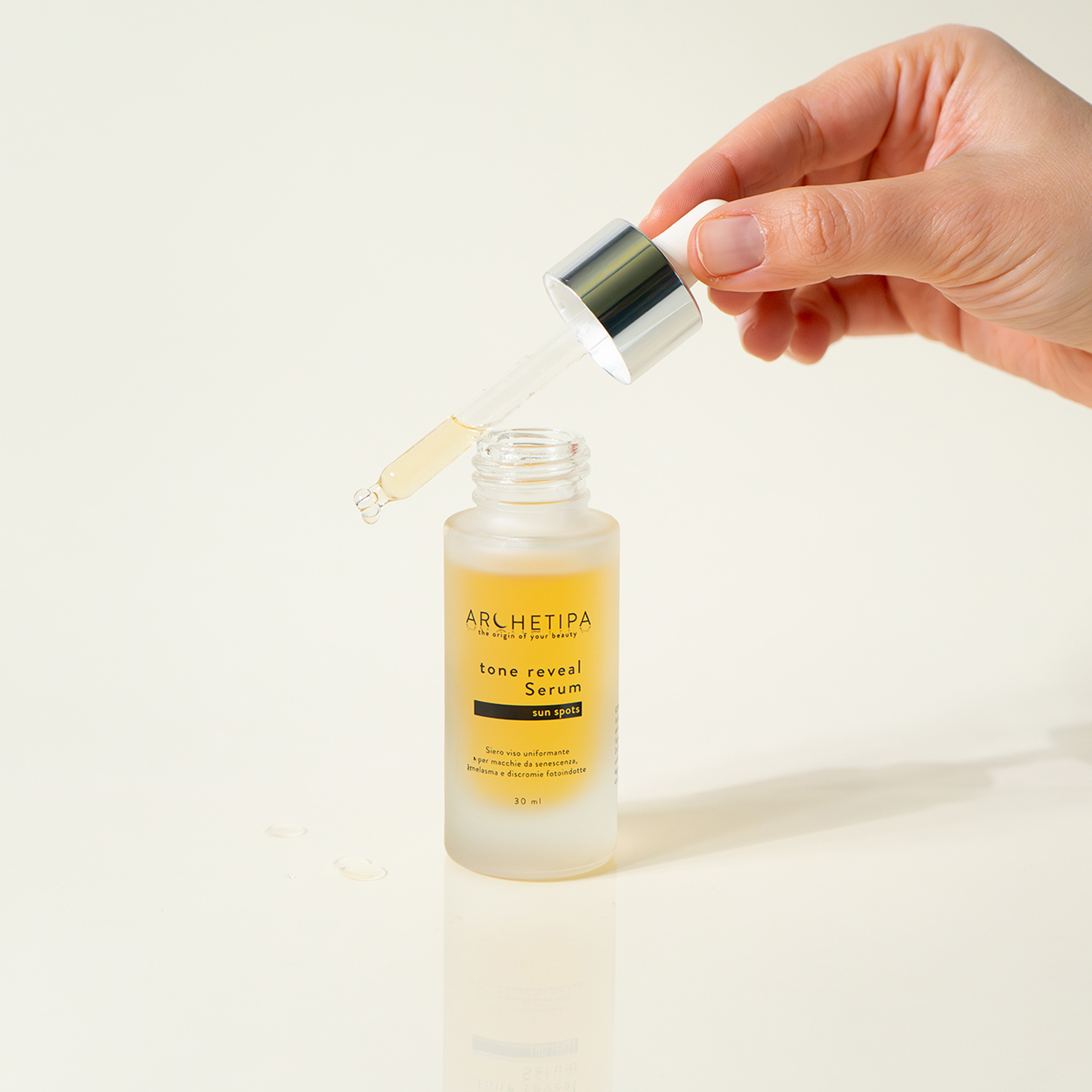 Applicare mattina e sera su pelle detersa, preferibilmente dopo l’applicazione di Archetipa essence. Distribuire alcune gocce su viso, collo e décolleté con movimenti leggeri, concentrandosi sulle zone interessate da macchie e discromie.
